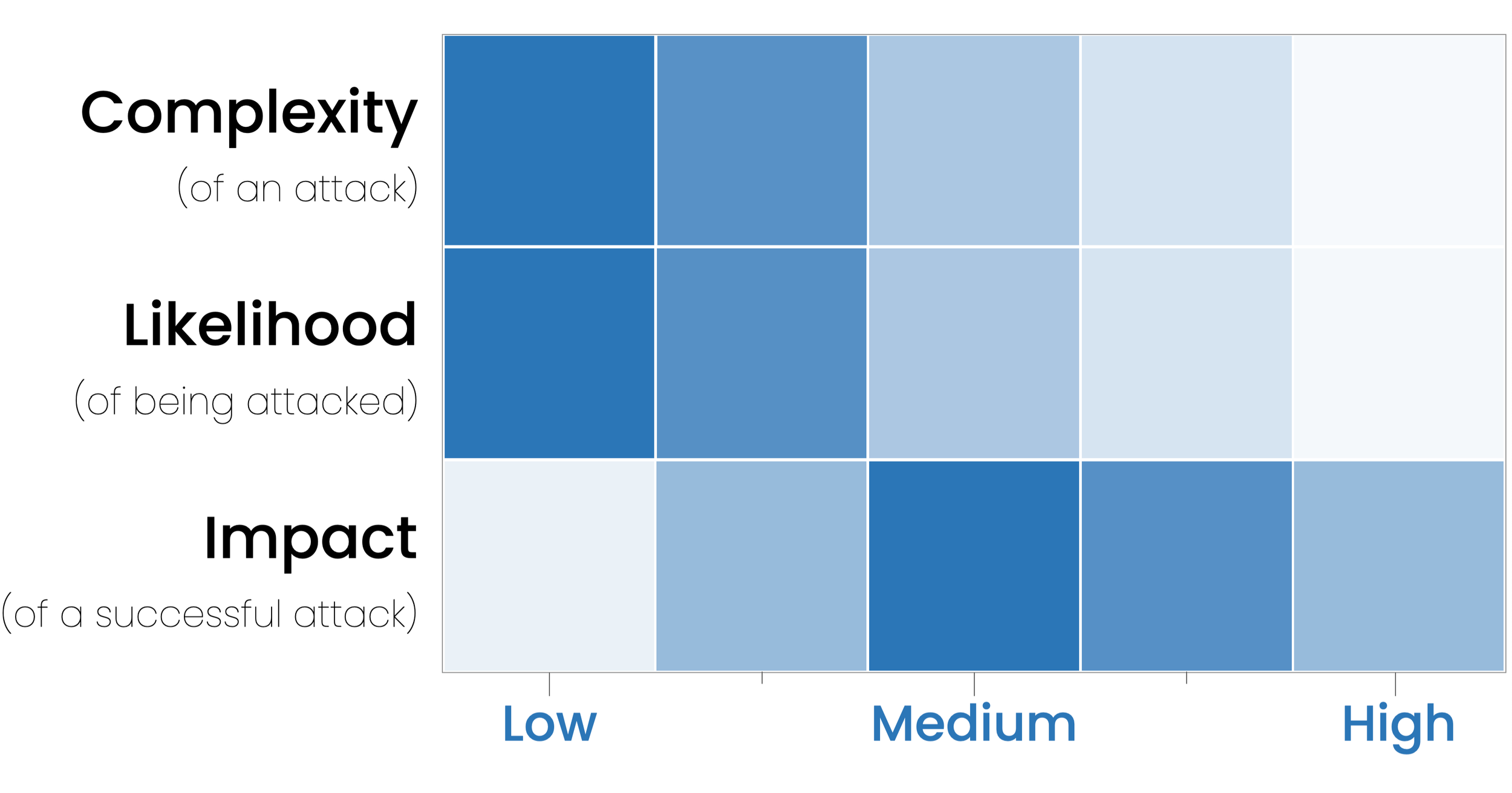 How should I think about my Attack CLI? As a guide, not an exact representation of your unique circumstances. Most solopreneurs will deal with LOW COMPLEXITY attacks (like phishing attacks). They will have a LOW LIKELIHOOD of being attacked (not bad). However, most solopreneurs will suffer a MEDIUM+ IMPACT from a successful attack (if a powerful enough attack penetrates your defenses, you are probably not prepared to withstand it).